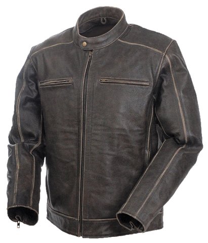 Mandarin collar Front chest vents with rear exhaust Zip in / Zip out liner Two front pockets / three inner pockets Thick cowhide leather - brown in color Distressed finish Zippered sleeve gussets Available in sizes 38-52Customer Reviews